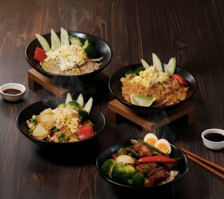 Savory jasmine rice stir-fried with egg, garlic, and onions, finished with lime and cucumber. A balanced, comforting Thai staple.